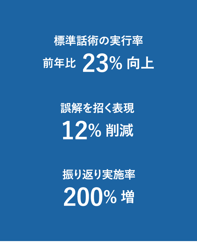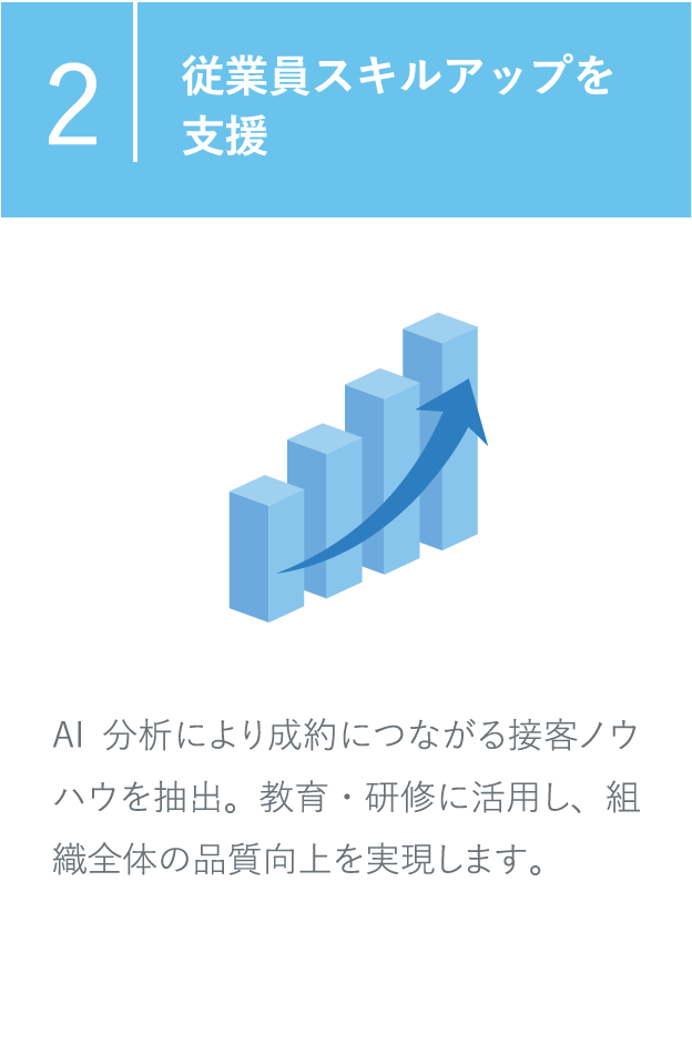 某不動産販売企業では、従来、社員が手作業でお客様情報シートを管理し、顧客の意向をエクセルに入力・整理していた。その結果、業務に多くの手間がかかるだけでなく、ターゲット顧客の全体像を把握・分析することが困難であった。こうした課題を解消するため、来店客による物件の評価を自動で抽出する仕組みを導入するとともに、販売員の接客トークを標準化することで、不適切な約束や誤解を招く説明に対して、タイムリーな介入を可能とする体制の構築が必要。